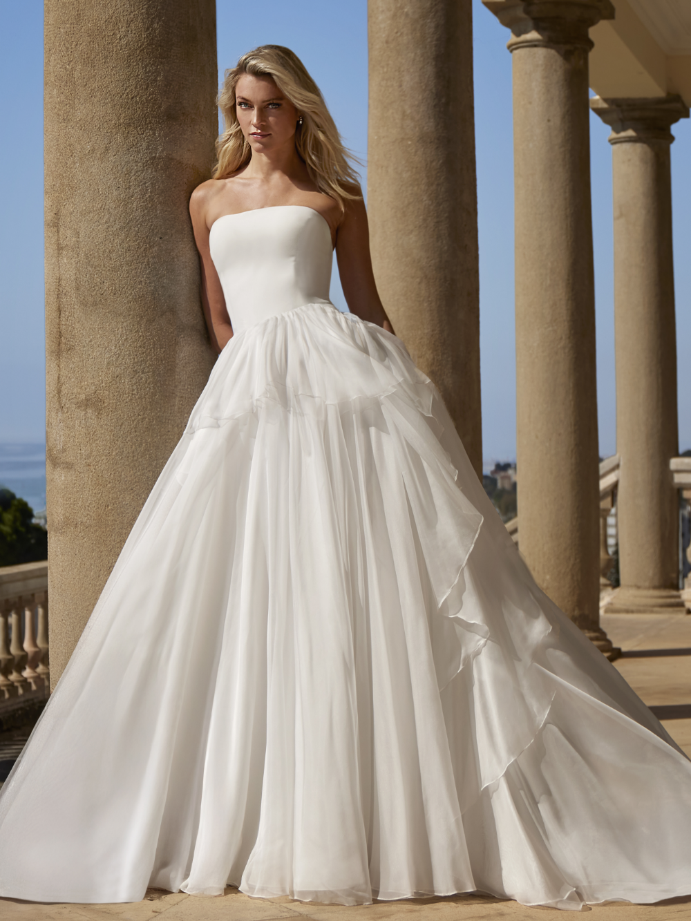 Ayleen by Pronovias is a dramatic yet refined statement piece—where structured simplicity meets voluminous romance. With a sleek crepe bodice and a layered organza skirt that floats with every step, Ayleen is designed for the bride who wants modern elegance with a touch of grandeur.