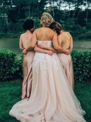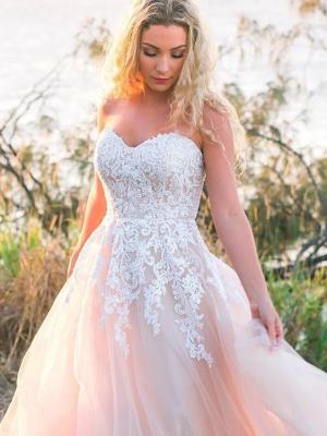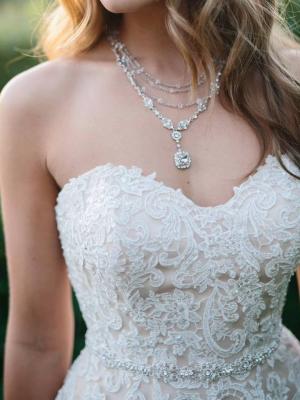 Her strapless sweetheart bodice reveals the décolletage and shoulders and does not seek to compete with the wearer’s bridal beauty.