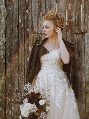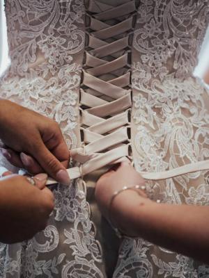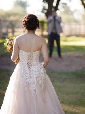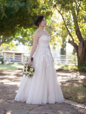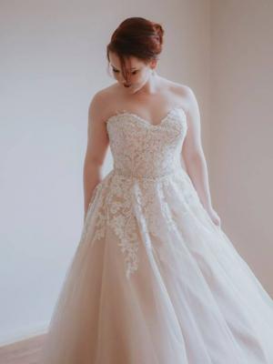 In tulle and lace she embraces her bride and entrances her spectators. Her predominantly lace bodice is drawn in at the waist with a lace-up back and extends in its detail into the lightly layered a-line skirt that delicately trails as the bride glides away in a substantially grand train.