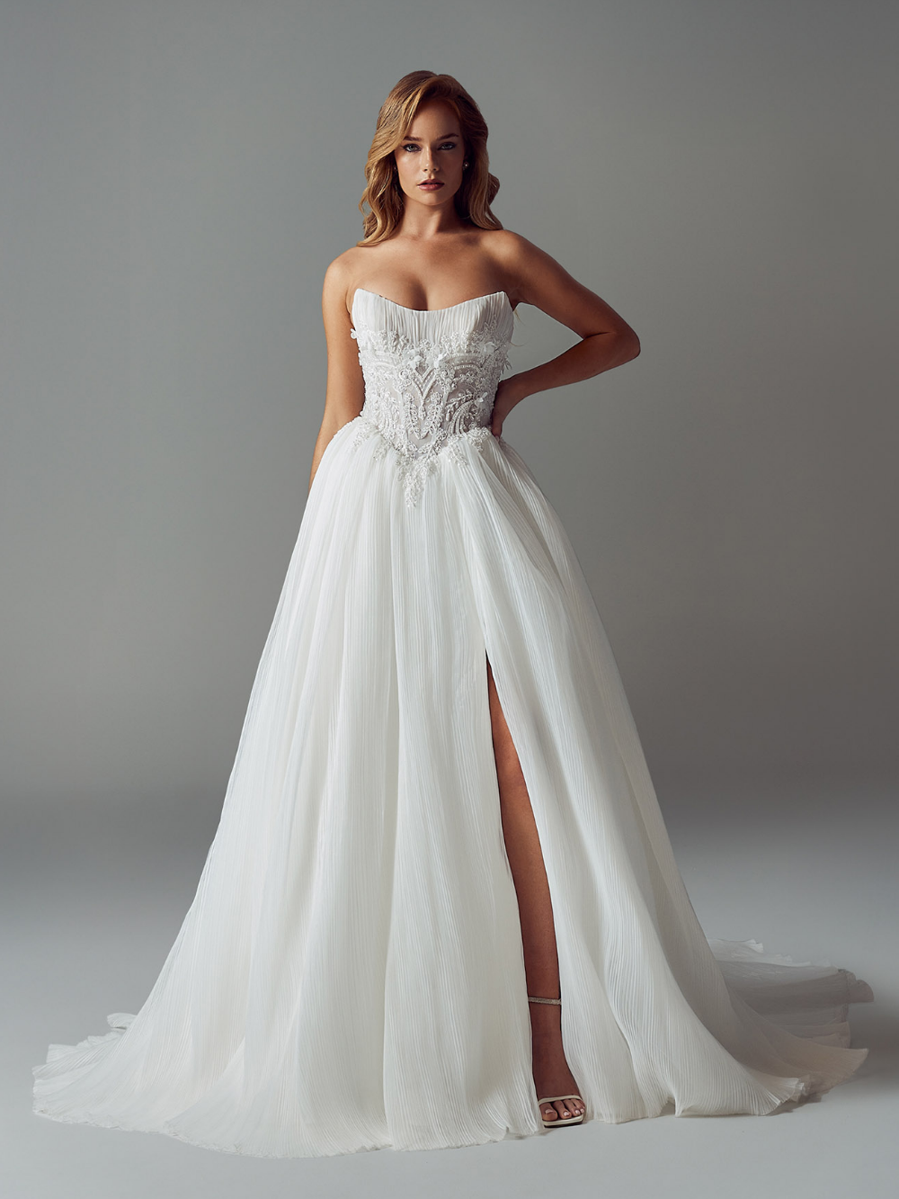 Lush, romantic, and undeniably glamorous, Delilah by Evie Young is a celebration of rich texture and modern artistry. Crafted in delicate pleated organza with layered embellishment, she creates a statement silhouette for the bride who wants unforgettable detail and feminine drama.