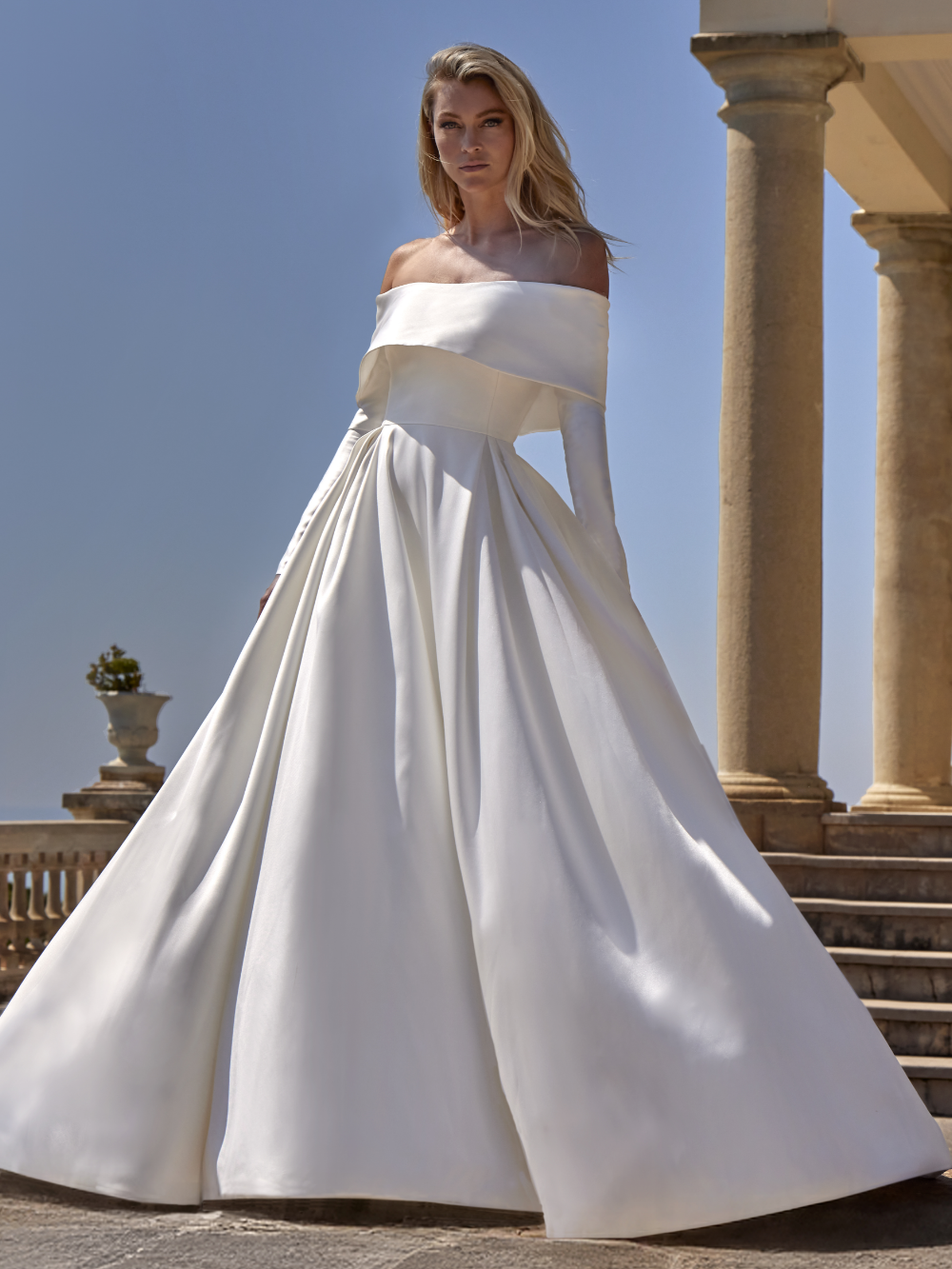 Delvine by Pronovias is a modern-day fairytale come to life—crafted in soft Mikado with a clean, architectural silhouette that speaks to refined elegance. This princess gown makes a quiet yet powerful statement with its sculptural simplicity.