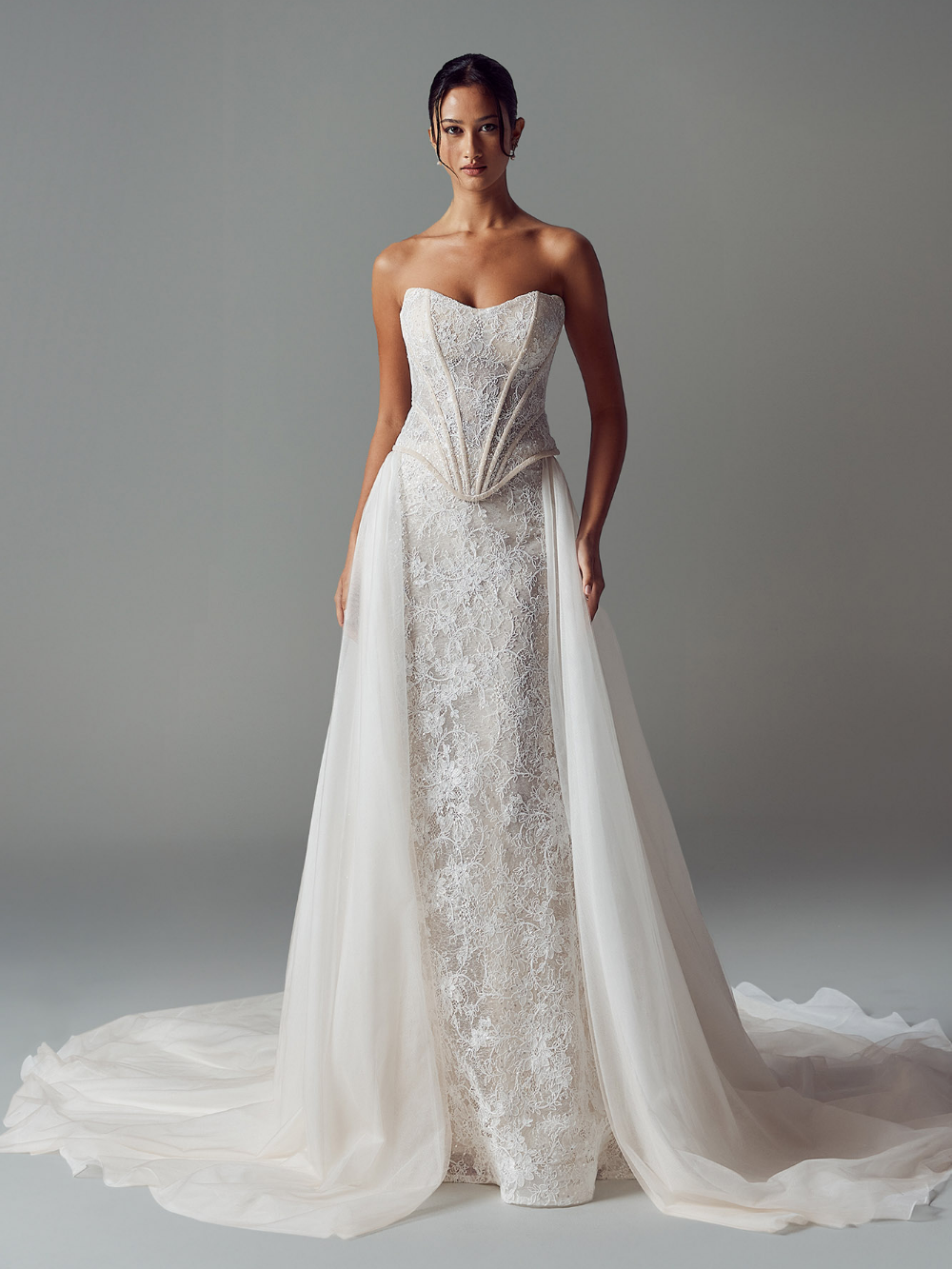 Light, airy, and effortlessly transformative, the Heather Overskirt by Evie Young is the perfect way to create two looks in one. Designed to add volume and ethereal drama, she brings soft movement and modern versatility to any bridal ensemble.