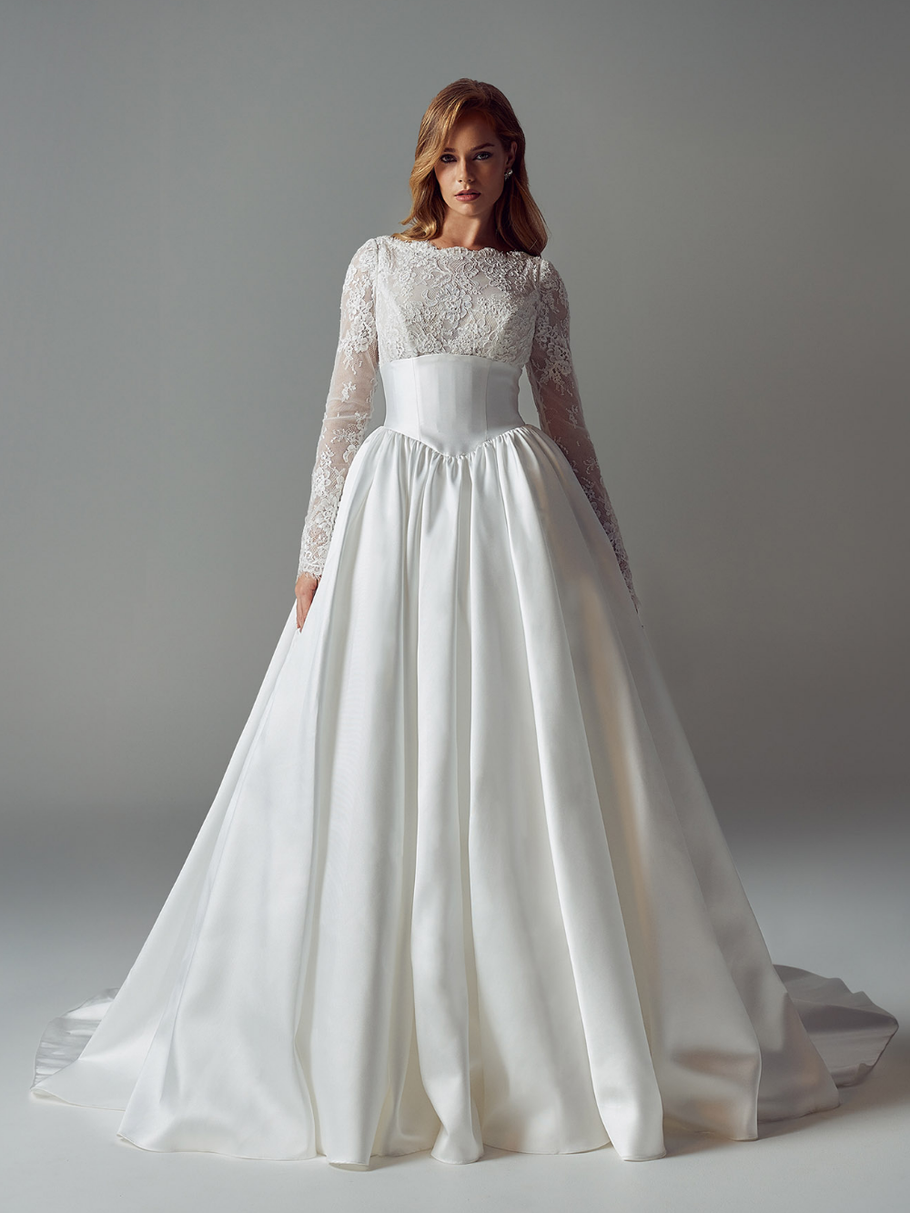 Timeless, romantic, and exquisitely detailed, Lucille by Evie Young is a celebration of vintage glamour. With contrasting textures of Chantilly lace and luxe Mikado, she blends classic bridal tradition with subtle modern refinement.