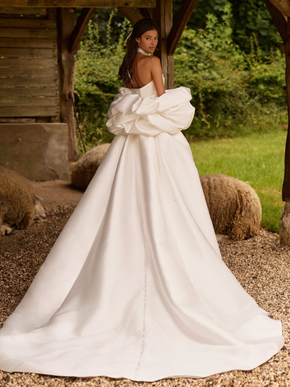 The Onyxelle bolero brings sculptural structure and bold styling to any bridal look. Crafted in glossy mikado, it offers statement volume through the sleeves while maintaining elegant lines across the back.