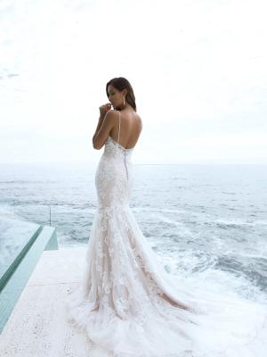Mia Solano’s Parker is a glamorous mirage, an optical spell, an exercise in trickery and seduction. In a flourish of paisley floral lace and eye catching crystal embellishments she is suddenly the only woman in the room. Her complexity runs deep with an underlay of shimmering grid lace and delicate tulle, and her appeal is that of both seduction and old world sophistication.
