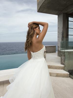 Her delicately embellished and beaded bodice accommodates a plunging sweetheart bust line discreetly drawn together with a fine mesh and extends ever so slightly beyond the natural waist elongating the body before exploding into a festive, textured skirt. Her graduated waterfall silhouette culminates in a full train that fleetingly steals attention from her cleverly engineered low back.