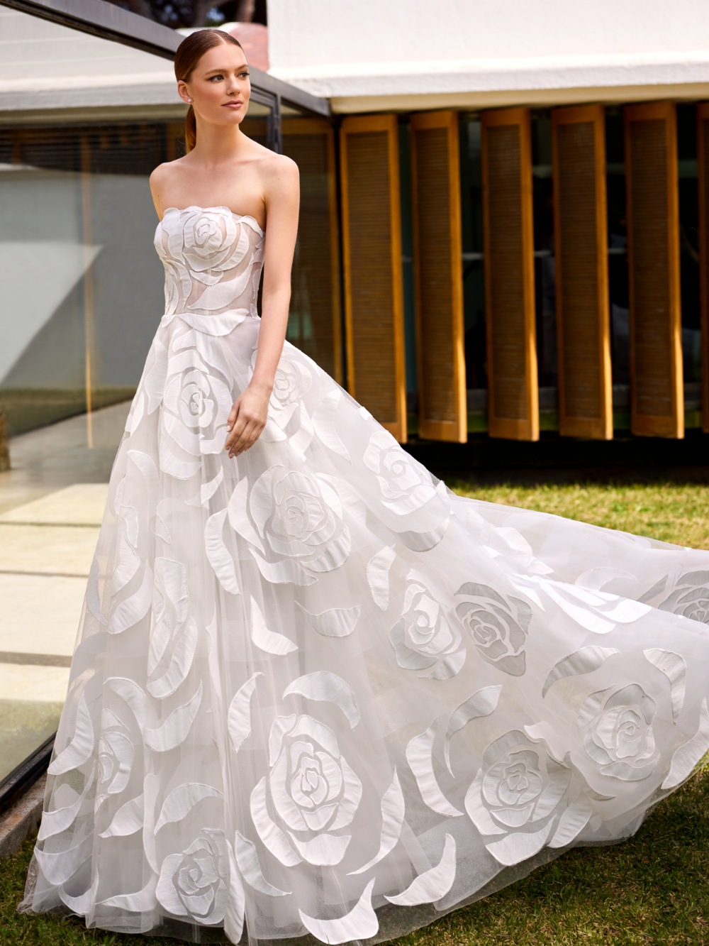 Pazit by Pronovias is a timeless beauty with a modern romantic soul. Designed for the bride who dreams in lace and volume, she brings together classic ballgown grandeur with artful floral detailing. A gown that feels both effortlessly regal and uniquely expressive.