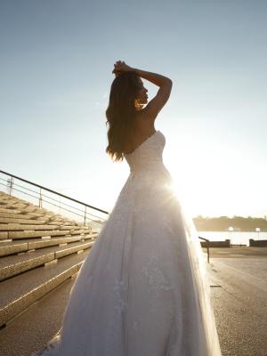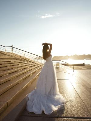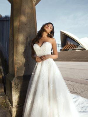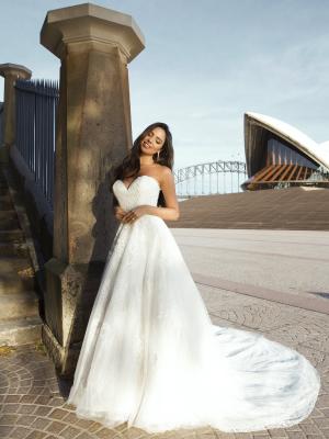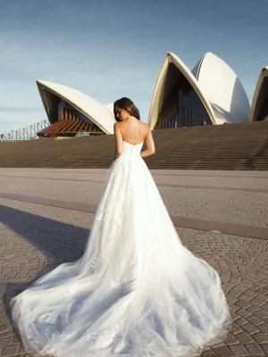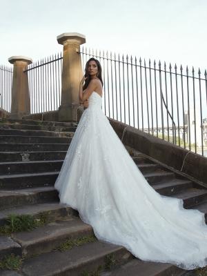 With a playful innocence Penn is a surprising composition of gossamer tulle, delicate lace and dense floral appliques amounting to a full a-line silhouette that minimises the waist and accentuates the deep sweetheart bust.