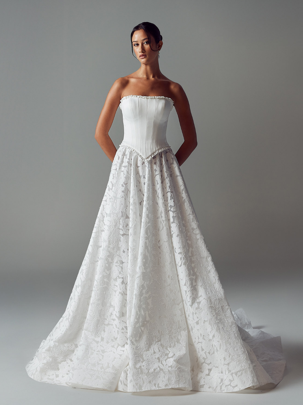A-line silhouette crafted in abstract floral lace reminiscent of the iconic Maven gown