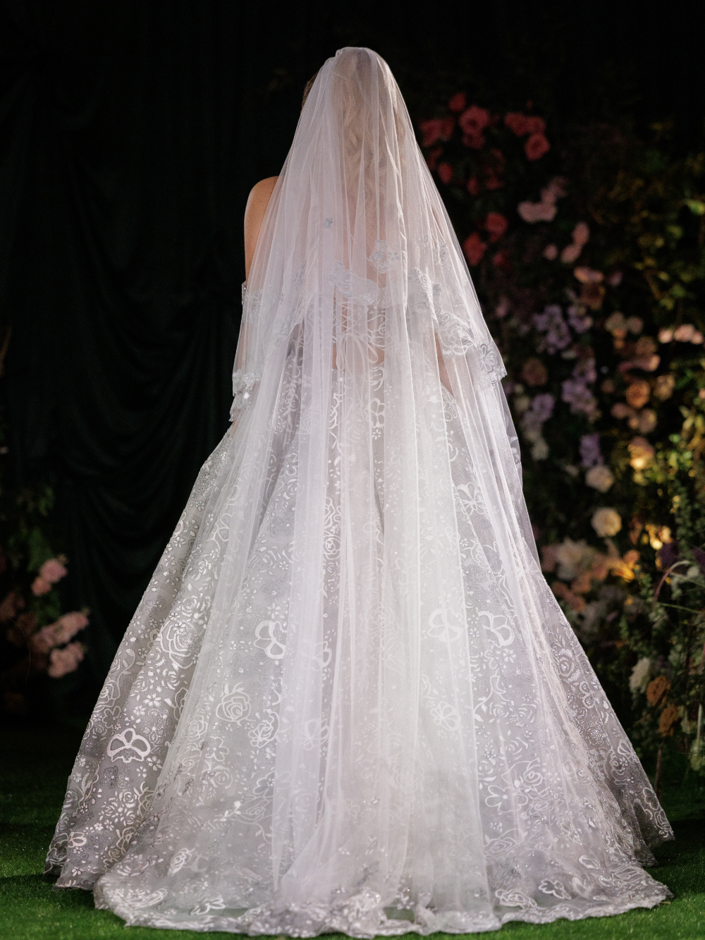 A luminous veil with caviar beading that mirrors the “Silver Springs” gown’s meteorite sparkle, catching the light with a subtle after-dark glow.
