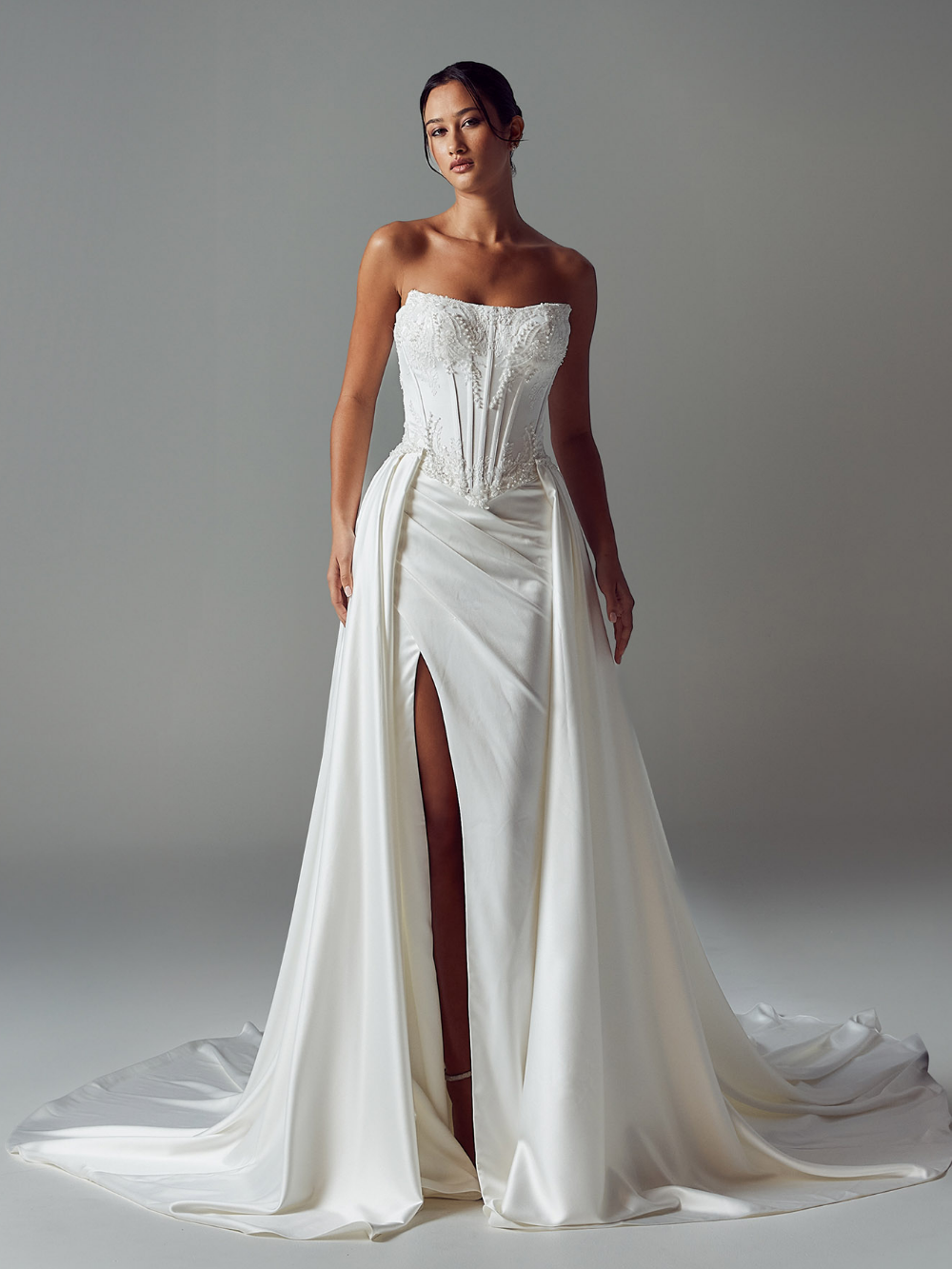 Modern, sleek, and effortlessly transformative, the Sunny Overskirt by Evie Young is designed for the bride who wants two looks in one with minimal effort and maximum impact. Crafted in slinky satin, she elevates any fitted silhouette with instant volume and drama.