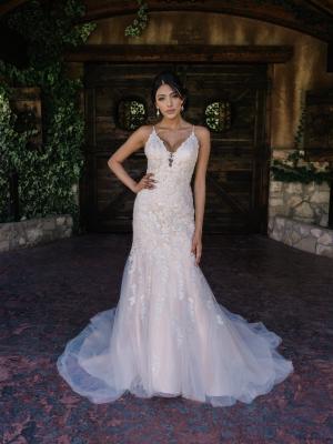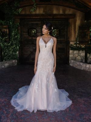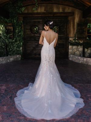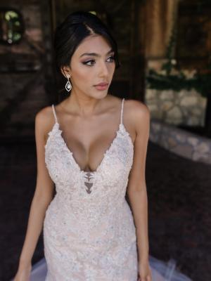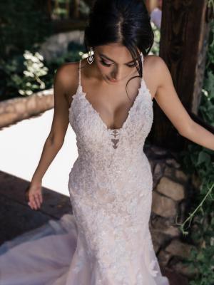 Tate is the essence of the classic wedding gown and achieves a modern elegant style. Her form-fitting silhouette extends to the knee before it gently flares into a chapel length train. The embellished spaghetti straps fall into the deep plunging neckline that is held together by a delicate mesh. The floral lace embellished bodice cascades down the length of the dress and has an intentional unfinished raw edge conveying an everlasting romantic gown.
