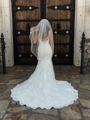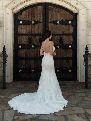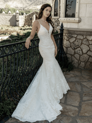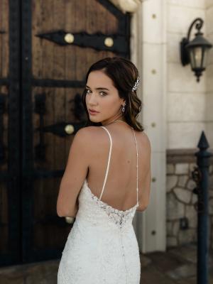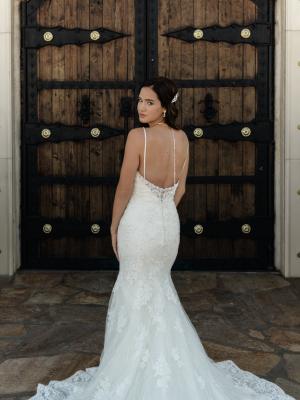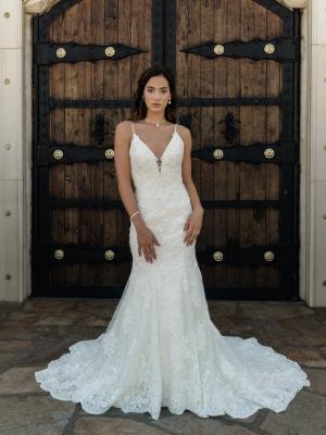 Tatum is an elegance that never goes out of style. Her deep plunging neckline, detailed beaded spaghetti straps and low cut back sets her apart from the crowd. She embraces the female form in delicate embellished and flattering floral lace from the bust to mid-thigh at which point she dramatically flares drawing the eye to her gorgeous curves. Hold the spotlight on your wedding day in this curve-hugging, sophisticated gown.