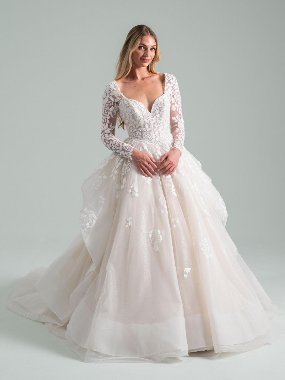 “The Light You Keep” blends softness with quiet strength. Mosaic floral appliqué flows across a sculpted bodice and layered tulle skirt, creating a subtle statement that grows stronger the longer you look. Designed for the bride who carries her own light and embraces the power of contrast, beauty, boldness and grace in one moment.